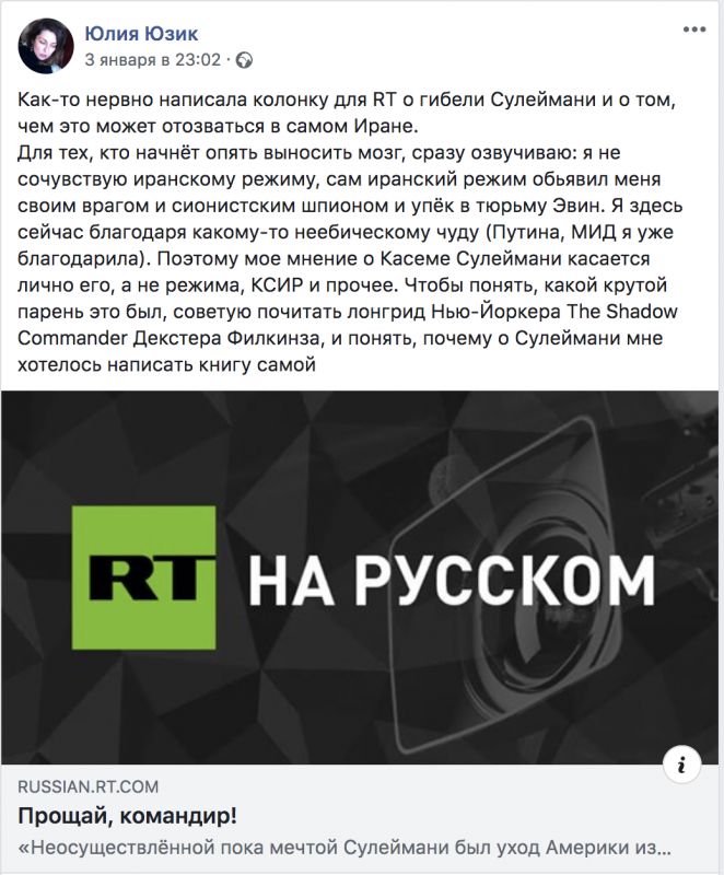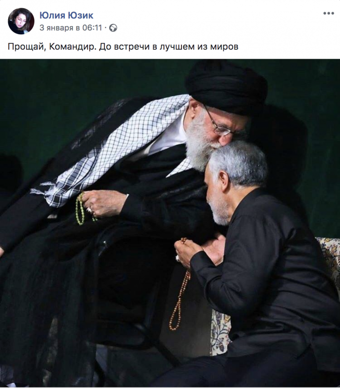 А потом убивают генерала Сулеймани, командира спецназа того самого на всю голову ебнутого КСИР, в котором сидела Юлия и на котором крови и трупов, как блох на бездомном псе, и Юлия пишет колонку, под названием "Прощай, командир".