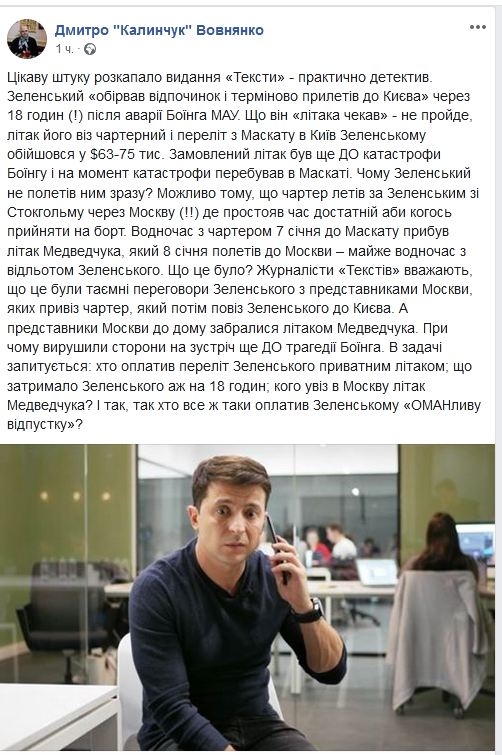 Зеленский «оборвал отдых и срочно прилетел в Киев» через 18 часов после крушения Боинга МАУ. Версия, что он «самолет ждал» — не пройдет, самолет его вез чартерный и перелет из Маската в Киев Зеленскому обошелся в 63-75 тыс. долларов.