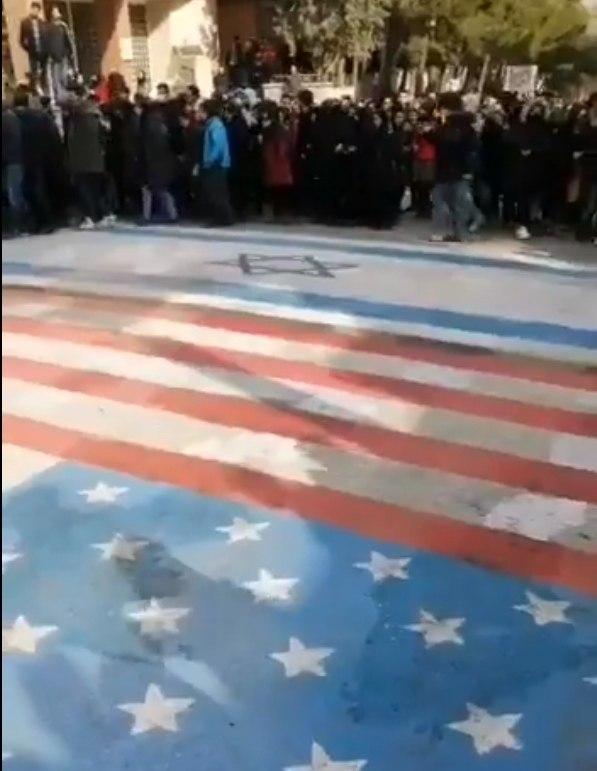 В Иране возобновились протесты против режима. Примечательно, что иранцы демонстративно обходят флаги США и Израиля, рисунки которых иранская пропаганда специально делала, чтобы люди топтались по ним.