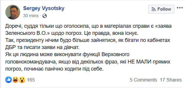 “Судья только что объявила, что в материалах дела есть заявление Зеленского В.О. Это правда, оно существует. Так, Президенту нечем было больше заняться, кроме как бегать по кабинетам ГБР и писать заявления на девушек”, – написал Высоцкий.