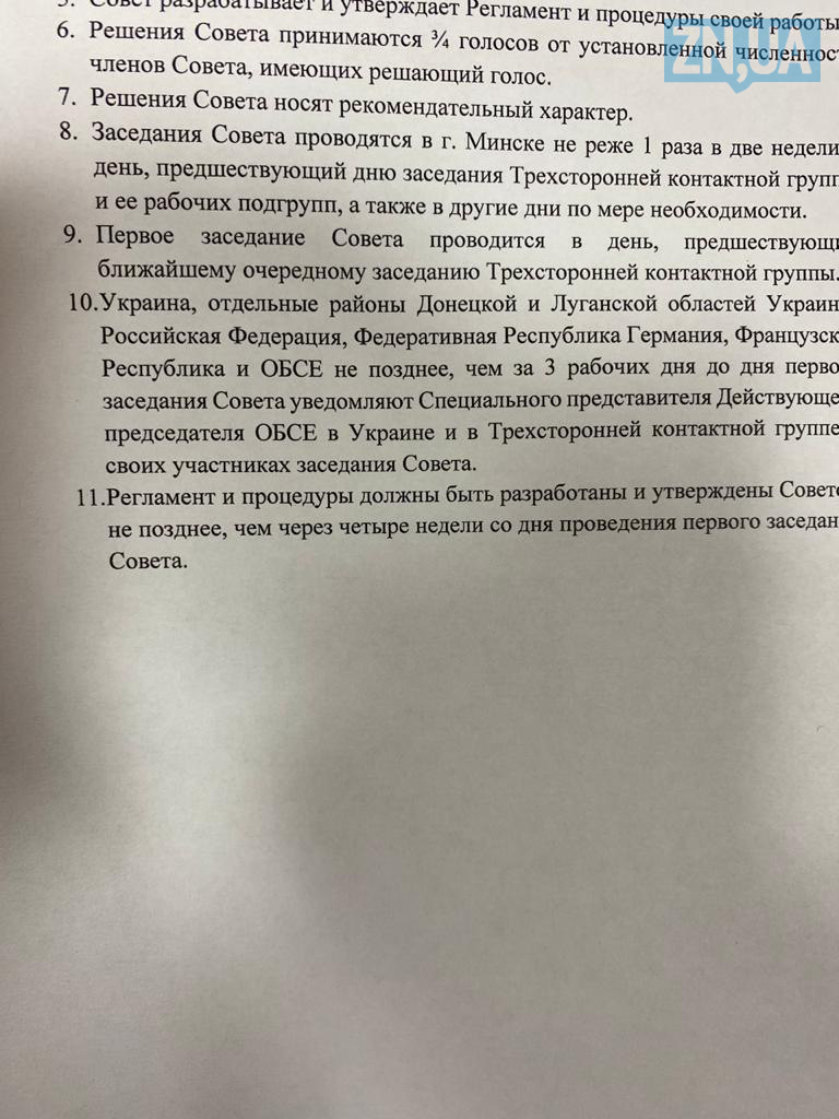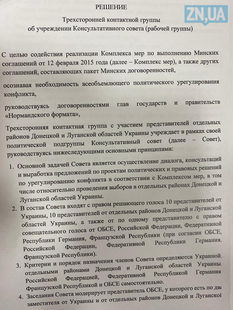"Основной задачей совета является осуществление диалога, консультаций и выработка предложений по проектам политических и правовых решений по урегулированию конфликта в соответствии с комплексами мер, в том числе относительно проведения выборов в отдельных районах Донецкой и Луганской областей Украины", – говорится в решении контактной группы.