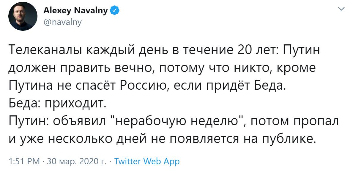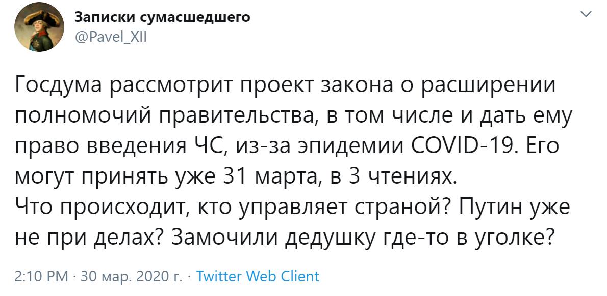 Что реально происходит, почему об «угрозе всей человеческой цивилизации» говорит не лидер нации, а вылезший из спячки Медведев, и почему режим карантина вводит мэр столицы, минуя подпись президента о введении ЧС, непонятно.