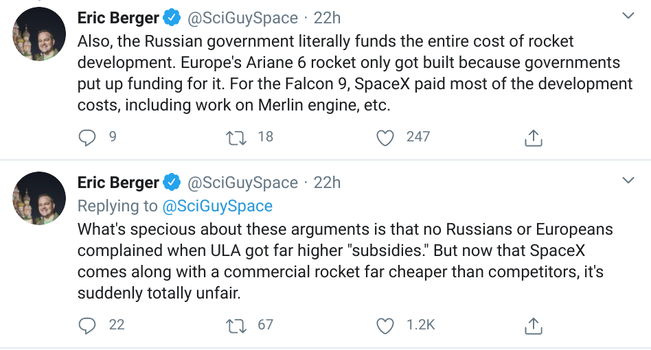 В свою очередь, Эрик Бергер, старший редактор портала Ars Technica говорит, что такие аргументы выглядят лицемерно, объясняя это тем, что ни европейцы, ни русские не жалуются, когда американская космическая корпорация получает большие “субсидии”.