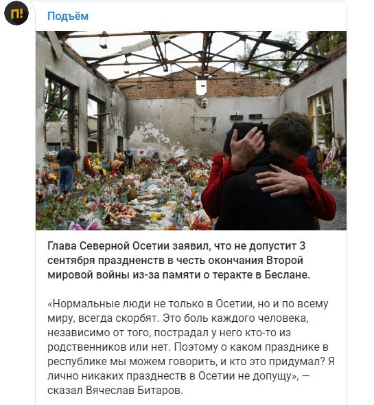 Глава Северной Осетии Вячеслав Битаров заявил, что не допустит проведения празднеств в честь окончания Второй мировой войны 3 сентября, в день памяти жертв теракта в Беслане. Слова Битарова 2 мая привел Telegram-канал "Подъем".