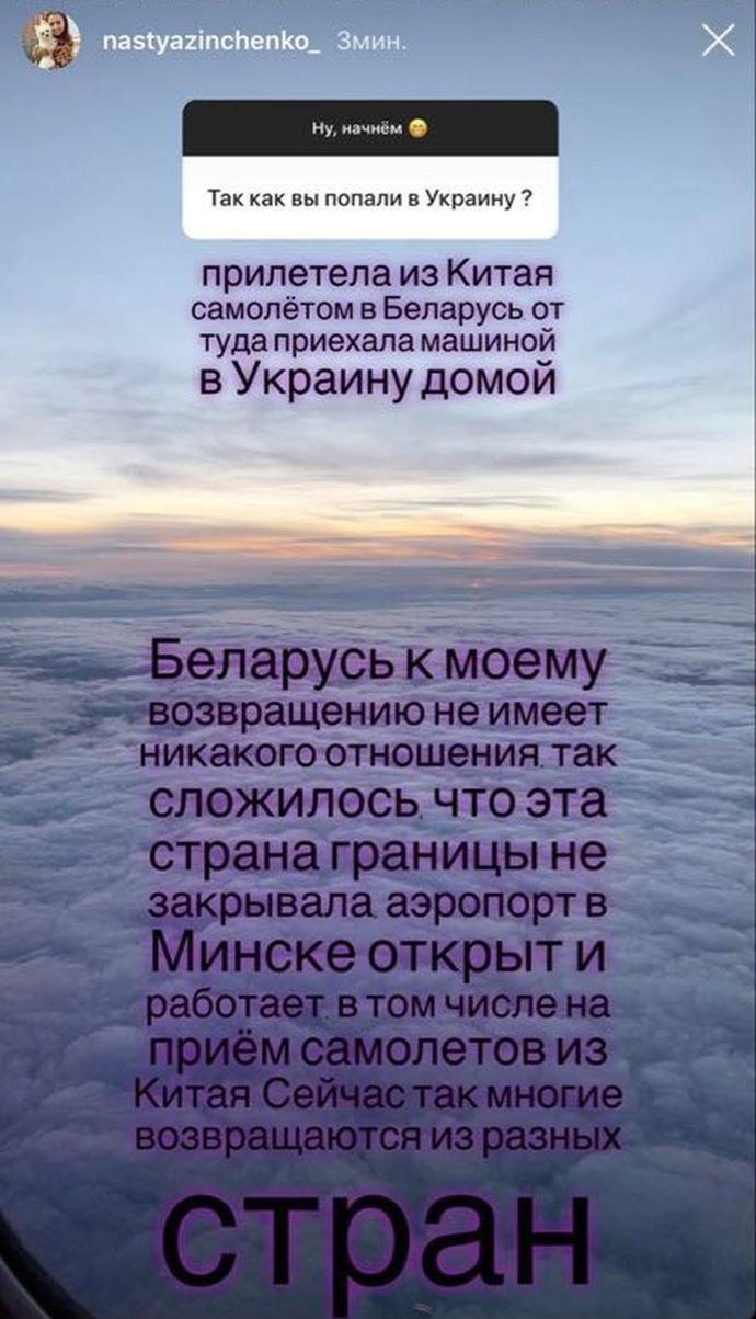 "Прилетела из Китая самолетом в Беларусь, оттуда приехала машиной в Украину домой", - рассказала Анастасия.