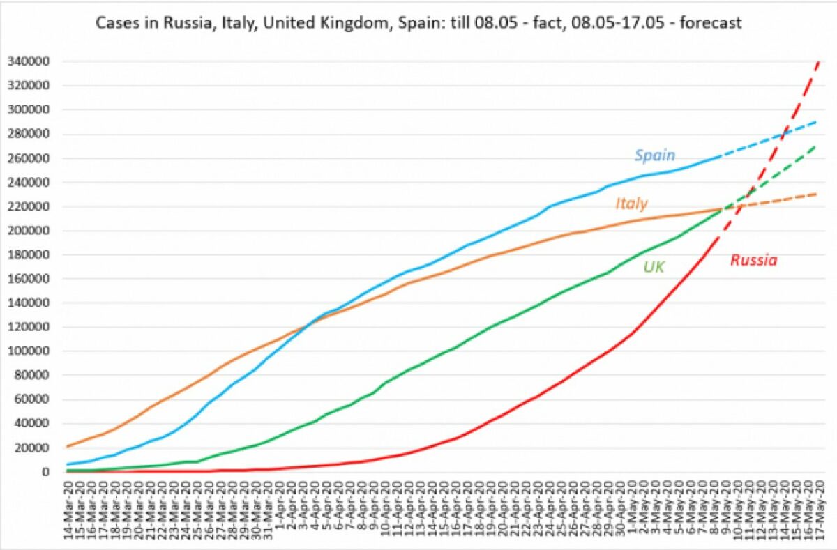 И следуя нынешним трендам в распространении инфекции, Россия уже обошла Италию, Великобританию и Испанию и заняла второе место в мире по числу заболевших COVID-19 после США. Россия полноправно заняла место второй мировой супердержавы по масштабам эпидемического кризиса.