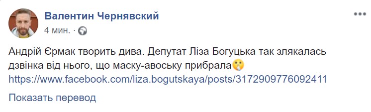 “Андрей Ермак творит чудеса. Депутат Лиза Богуцкая так испугалась звонка от него, что маску-авоську убрала”, — отреагировал на своей странице журналист.