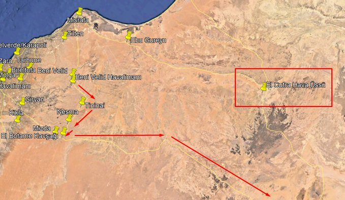 Ночью колонна из 323 транспортных средств прошла по населенному пункту Несма к перекрестку в Эль-Ботаме и направилась на юг, в Эль-Куфру.