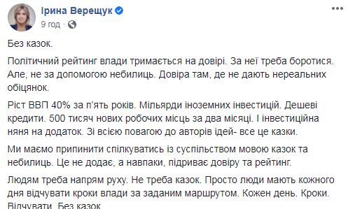 Со всем уважением к авторам идей - но все это сказки. Мы должны прекратить общаться с обществом языком сказок и небылиц. Это не прибавляет, а наоборот, подрывает доверие и рейтинг. Людям надо направление движения. Не надо сказок. Просто люди должны каждый день чувствовать шаги власти по заданному маршруту. Каждый день. Шаги. Чувствовать. Без сказок", - заявила Верещук.
