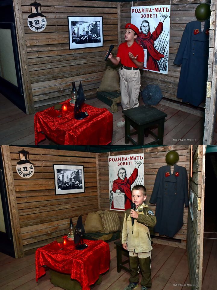 В частности, школьников согнали на тематический концерт в импровизированном "блиндаже" с соответствующим антуражем и одели в военную форму современных российских оккупантов и военизированной детской организации "Юнармия". Соответствующие фотографии обнародовал на своей странице в Facebook офицер ВСУ, полковник Анатолий Штефан (Штирлиц).