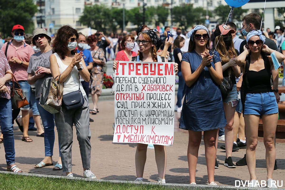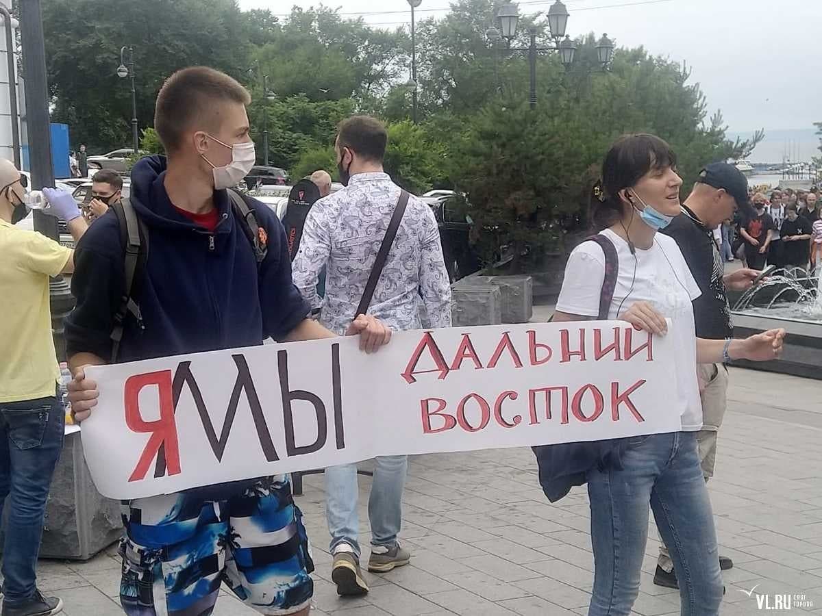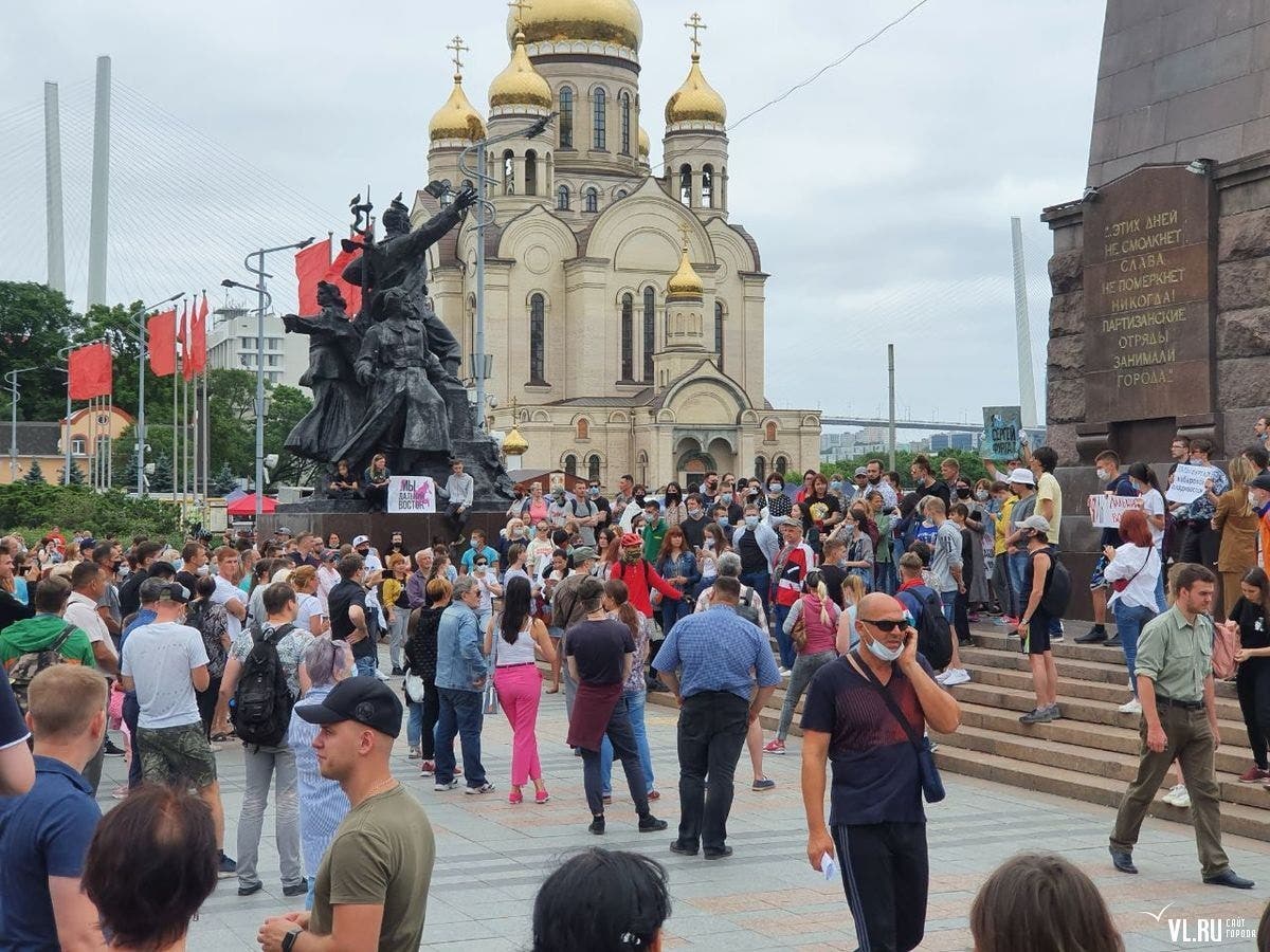 Сегодня также прошла акция солидарности во Владивостоке. Люди вышли на центральную площадь города, скандируя в мегафон лозунги в поддержку арестованного губернатора Хабаровского края. По оценке Vl.ru, в акции приняли участие 500-1000 человек. В Комсомольске на митинг пришли около тысячи человек.