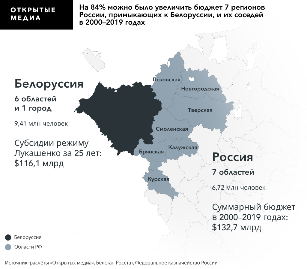 По подсчетам издания, если бы Кремль отказался от спонсорства режима Лукашенко, то за последние 10 лет бюджет 7 областей России, которые граничат с Беларусью, увеличился бы на 84%.