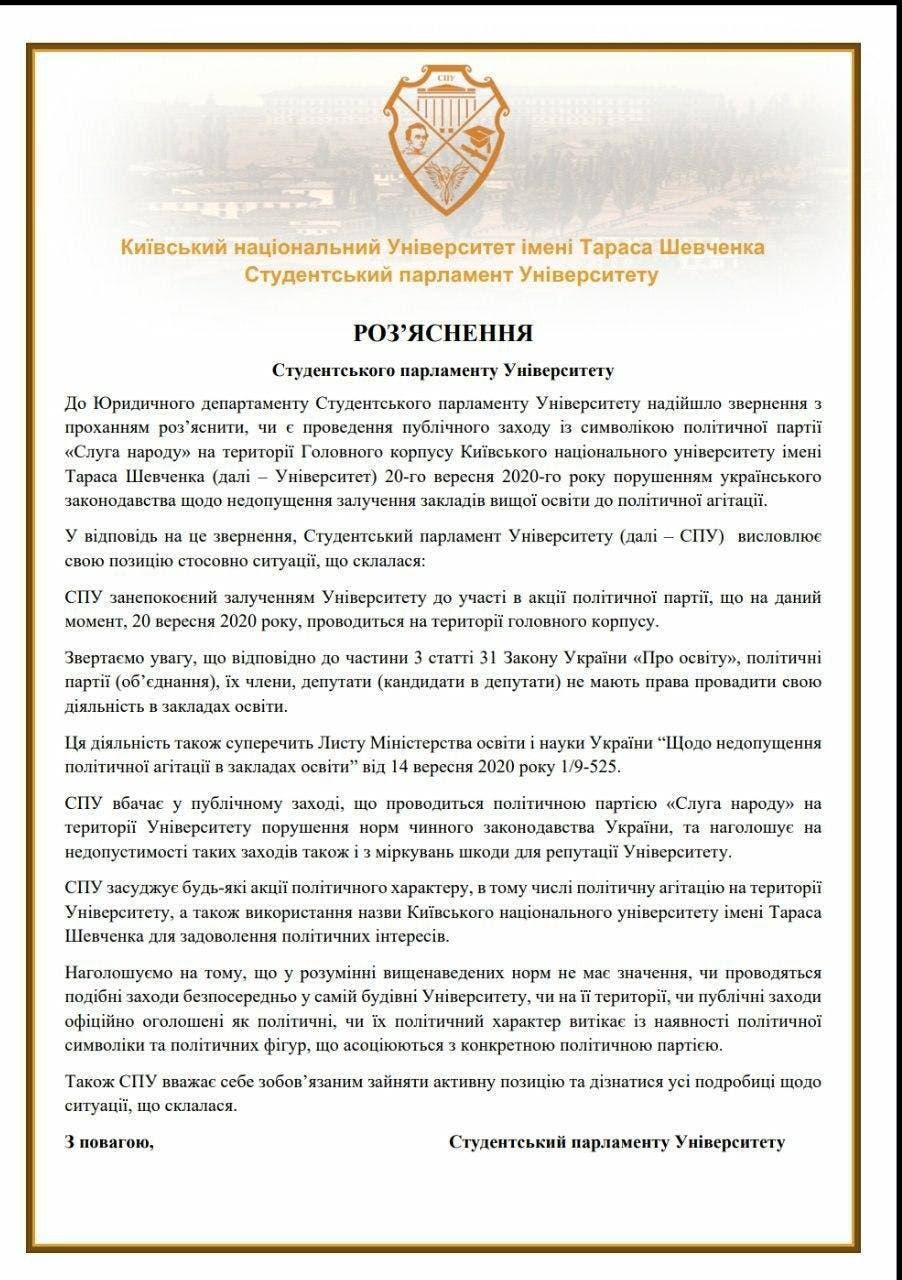 «Если КНУ хочет сохранить собственное лицо и доказать, что он является ВУЗом европейского уровня, Леонид Васильевич должен уже завтра быть отстранен от выполнения обязанностей ректора университета за нарушение Устава КНУ и Закона Украины», — заявил студенческий парламент.