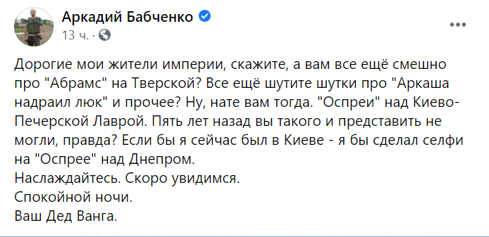 Бабченко, который несколько лет назад после переезда в Украину из России обещал, что вернется в РФ и появится в Москве на американском танке "Абрамс", напомнил россиянам о своем обещании фотографией из Киева.