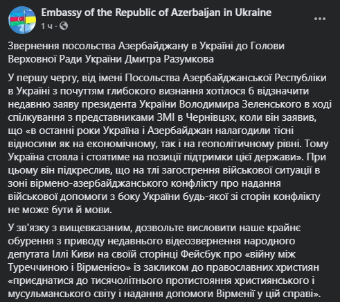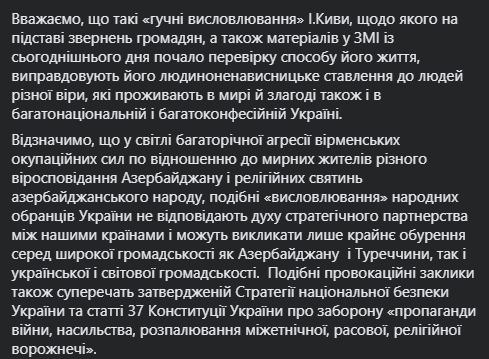 "Позвольте выразить наше крайнее возмущение по поводу недавнего видеообращения народного депутата Ильи Кивы на его странице Facebook о "войне между Турцией и Арменией" с призывом к православным христианам "присоединиться к тысячелетнему противостоянию христианского и мусульманского мира и оказания помощи Армении в этом деле", – говорится в сообщении.