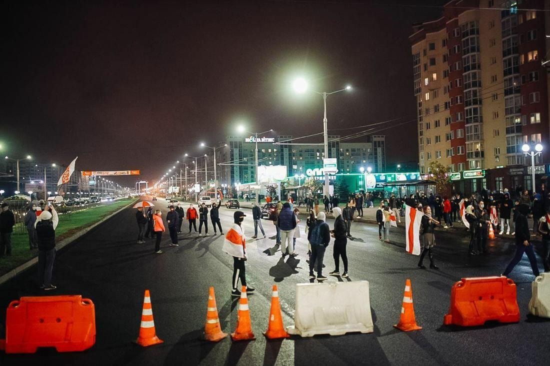 В разных районах города протестующие выстраиваются в цепи солидарности и перекрывают дороги. Как сообщает TUT. BY, в Шабанах на дороге подожгли покрышки. В районе Каменной горки, где особенно жестко действовал ОМОН, дорогу завалили пластиковыми блоками.