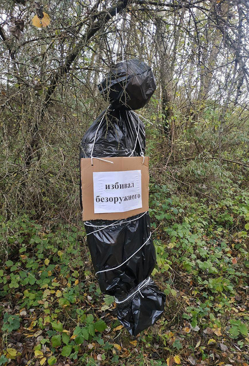 С помощью мусорных пакетов люди сооружают чучела силовиков и развешивают их на деревьях в разных местах города Брест. Некоторые из них снабжены надписями.