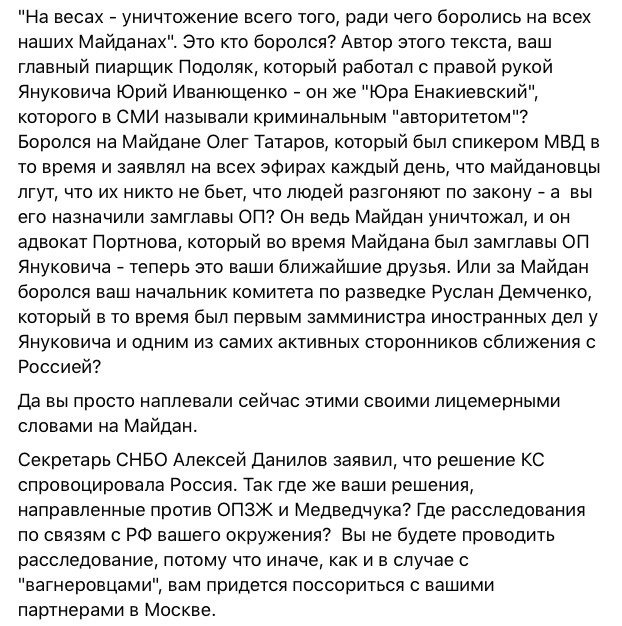 Разве не вы обещали проблемы Медведчуку, а он вместо этого купил два телеканала и расширяет бизнес? Вот это и есть на практике та самая "грязная политика, когда своим - все, а обществу - нищета"",