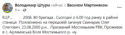 Утром субботы, 7 ноября, на Донбассе погиб боец 80-й отдельной десантно-штурмовой бригады ВСУ Олег Свинарик.