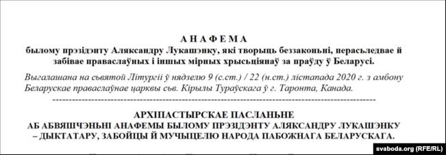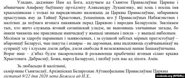 «Благочестивый белорусский народ сейчас переживает непростое время, когда по приказу самозванца — бывшего президента Александра Лукашенко, одержимого дьяволом, наши дети убивают и издеваются над нашими братьями и сестрами», — говорится в анафеме.