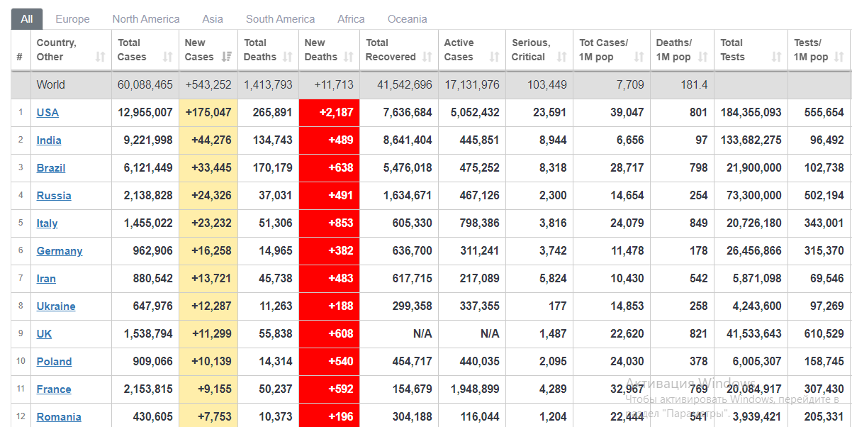 За минувшие сутки, 25 ноября, Украина заняла восьмое место по количеству новых зараженных коронавирусом (COVID-19) – 12 287. Лидером же остаются США – 175 047. Всего в мире заразилось более 60 млн человек.