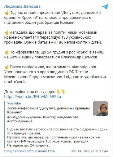 Также Денисова отметила, что получила ответ от российского омбудсмена Татьяны Москальковой по ее запросу на поездку в оккупированный Россией Крым для проверки условий содержания заключенных.