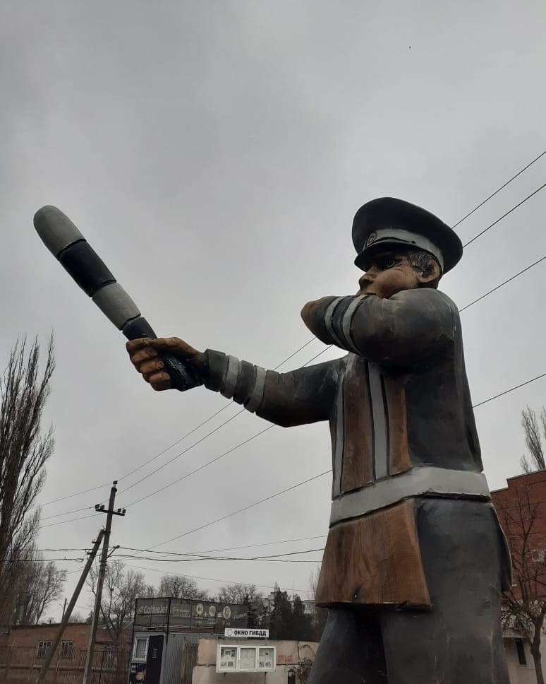 Деревянная скульптура гаишника появилась в городе Азов Ростовской области у здания местного отделения, причем сделали ее из старого дерева местные мастера.