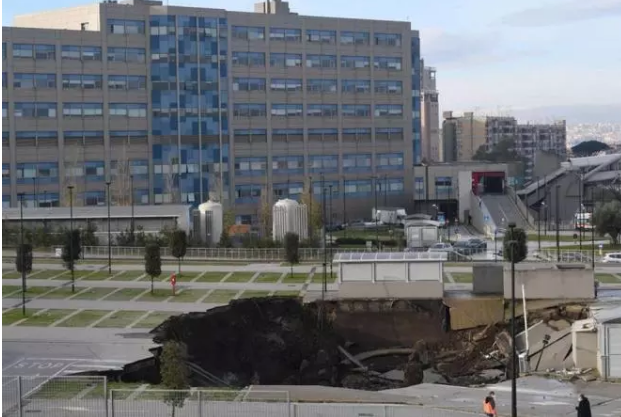 Инцидент произошел на рассвете в пятницу, 8 января. К счастью, обошлось без жертв. Однако в воронку провалилось несколько авто. Также в больнице отключилась электроэнергия. Был эвакуирован центр лечения больных Covid-19.