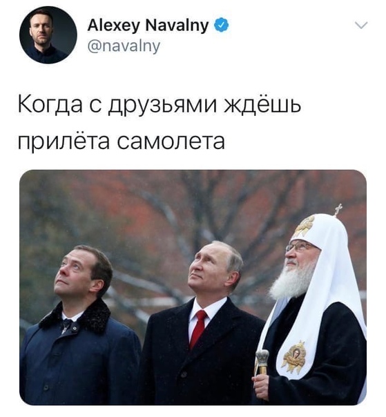 К тому же, Навальный опубликовал фото, где Путин, Дмитрий Медведев и патриарх РПЦ Кирилл смотрят в небо, а также написал «Когда с друзьями ждешь прилета самолета».