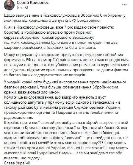 Генерал Кривонос продолжил: «В стране, против которой седьмой год происходит вооруженная агрессия, в которой оккупированы Крым и часть Донецкой и Луганской областей, которая имеет тысячи погибших и раненых и более миллиона беженцев, открытые обвинения воинов в «преступлении» - это пройдены даже не красные линии, а все пределы! Или кто-то имеет позицию другую? Другую имеют только те, кто против нашей Украины, свободной и независимой. Другую имеют «московские вши и украинские гниды»... но мы найдем керосин, чтобы вывести эту гадость... Слава Украине!».