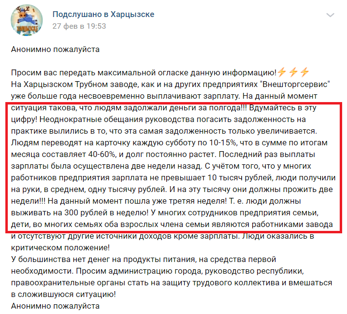 Источники сообщают, что последний раз сотрудникам предприятия деньги выплатили 3 недели назад: это были 15% от зарплаты за сентябрь 2020 года. Таким образом, люди не получают зарплату в течение 6 последних месяцев.