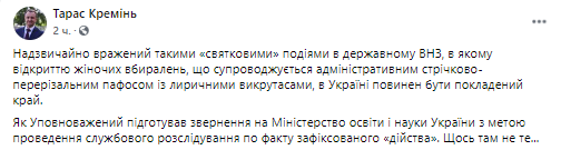 "Чрезвычайно поражен такими "праздничными" событиями в государственном вузе, в котором открытию женских уборных, сопровождающемся административным ленточно-перерезательным пафосом с лиричными выкрутасами, в Украине должен быть положен конец. Как уполномоченный подготовил обращение в Министерство образования и науки Украины с целью проведения служебного расследования по факту зафиксированного "действа". Что-то там не то", - написал Креминь в Facebook.