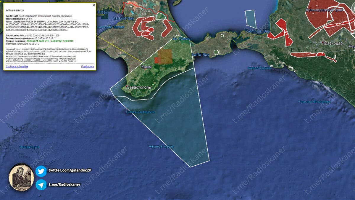 Согласно координатам, в зону ограничения полетов до высоты 19 000 метров входит воздушное пространство над Крымом от Феодосии до Севастополя, а также на юг в международных водах Черного моря.