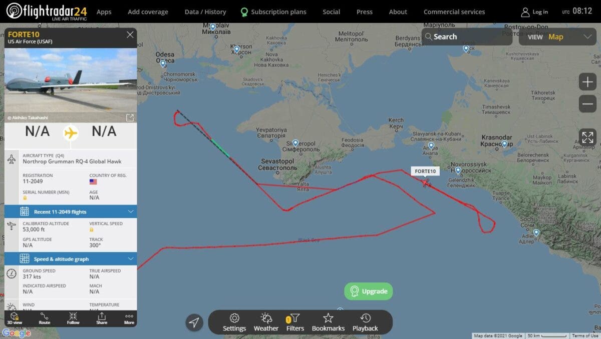 Стратегический разведывательный беспилотник RQ-4B Global Hawk Воздушных сил США проигнорировал «запрет» России на полеты вдоль оккупированного Крыма. Об этом сообщает «Украинский милитарный портал».