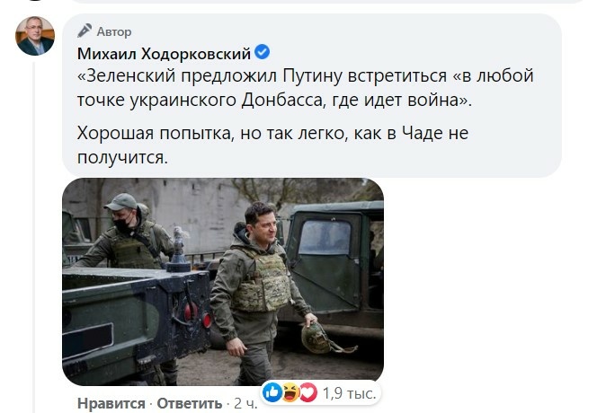 Российский оппозиционер Михаил Ходорковский в Facebook прокомментировал предложение президента Украины Владимира Зеленского встретиться с президентом РФ Владимиром Путиным на Донбассе.