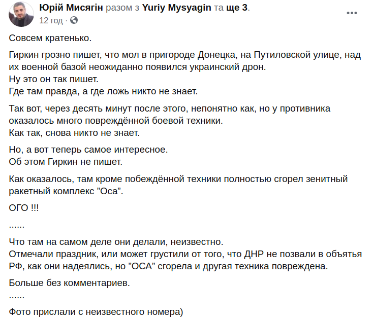 Что там на самом деле они делали, не известно. Отмечали праздник, или может, грустили от того, что ДНР не позвали в объятья РФ, как они надеялись, но "Оса" сгорела и другая техника повреждена. Больше без комментариев. Фото прислали с неизвестного номера)" – написал Мысягин.