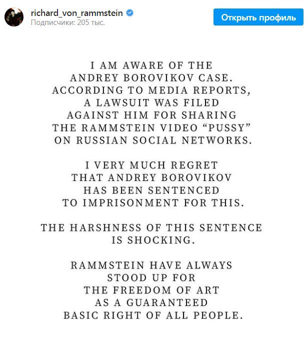 "Очень сожалею, что Андрей Боровиков приговорен за это к тюремному сроку. Суровость приговора шокирует. Rammstein всегда отстаивала принцип свободы творчества как неотъемлемое право человека", – отметил Круспе.