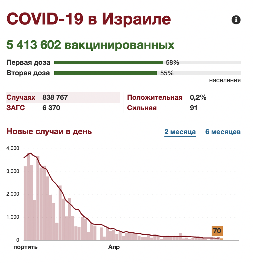 И вот именно в одном из этих изданий наше внимание привлекла картинка из тех, которые часто прикрепляются к главной странице. Обычно там демонстрируют живой график биржевых показателей или чего-то подобного. Здесь же была вставка, посвященная динамике КОВИД в Израиле.