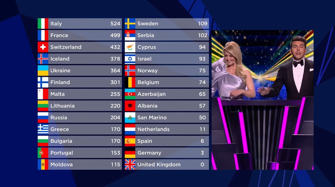 Согласно баллам профессионального жюри из 39 стран, лидерами стала Швейцария — певец Gjon’s Tears с проникновенной композицией Tout l’univers.