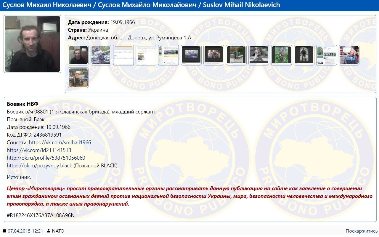 Отметим, что уроженец Донецка Суслов Михаил Николаевич 1966 года рождения значится в базе "Миротворца". Там указано, что в "ДНР" "Блэк" воевал в составе в/ч 08801 (1-я Славянская бригада), был младшим сержантом.