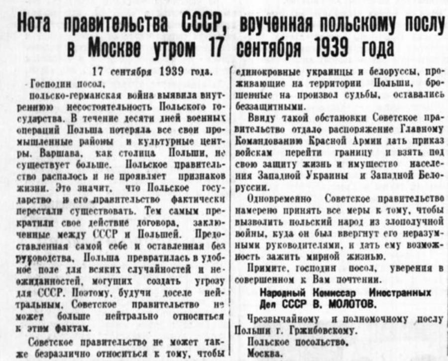 “Польско-германская война выявила внутреннюю несостоятельность Польского государства. В течение 10 дней военных операций Польша потеряла все свои промышленные районы и культурные центры. Варшава как столица Польши не существует больше. Польское правительство распалось и не проявляет признаков жизни.. Это значит, что Польское государство и его правительство фактически перестали существовать. Тем самым прекратили свое действие договора, заключённые между СССР и Польшей...