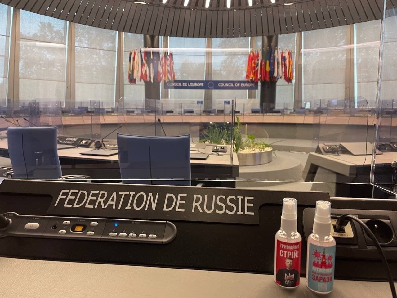 "Посетил зал заседаний Комитета министров Совета Европы в правильной футболке. На этом месте обычно сидит представитель России. Но, как мы видим, сейчас его нет. Все потому что я привез с собой антисептики от кремлевской заразы. Место обработано – заразы нет", – подчеркнул нардеп.