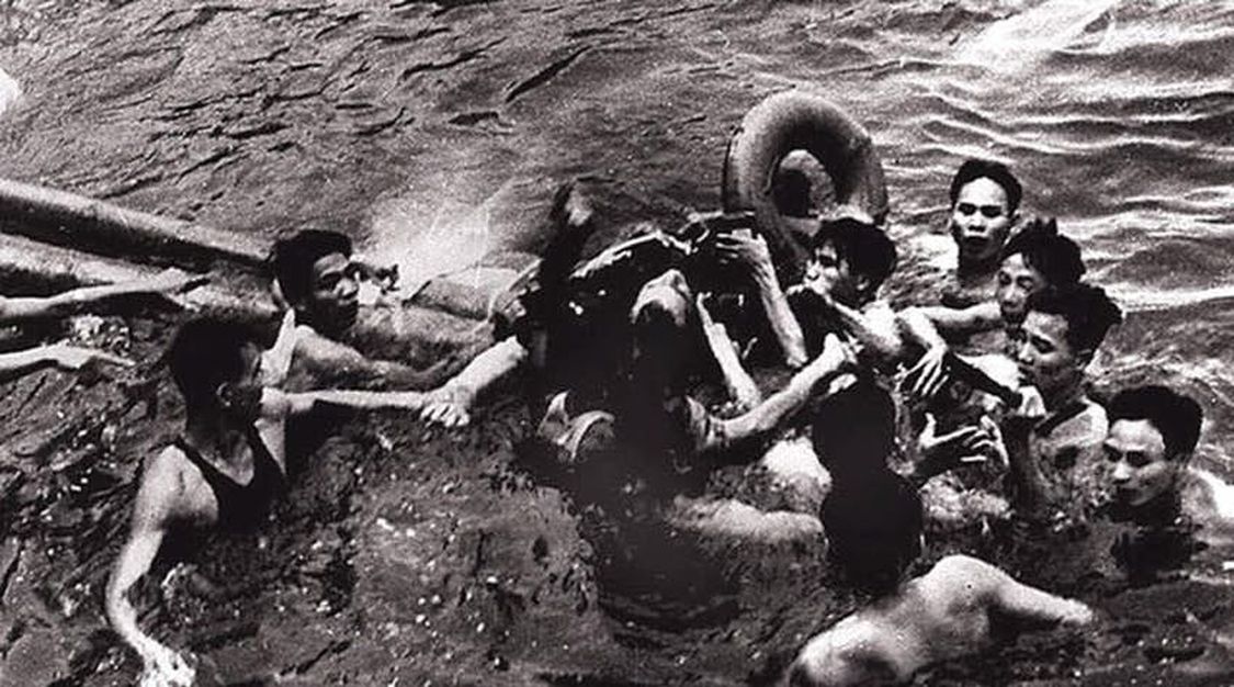 А изображен здесь момент захвата в плен пилота ВВС США Джона Маккейна. Его самолет сбили в ходе операции Rolling Thunder (1967 год) в районе Ханоя.
