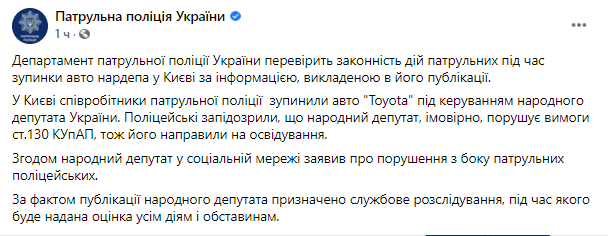 После того, как у нардепа забрали водительское удостоверение, он прибыл в Дарницкое управление полиции, где написал заявление на патрульных.