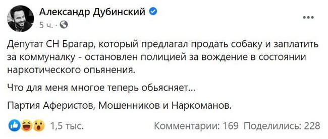 Он отметил: "Депутат СН Брагар, который предлагал продать собаку и заплатить за коммуналку - остановлен полицией за вождение в состоянии наркотического опьянения.