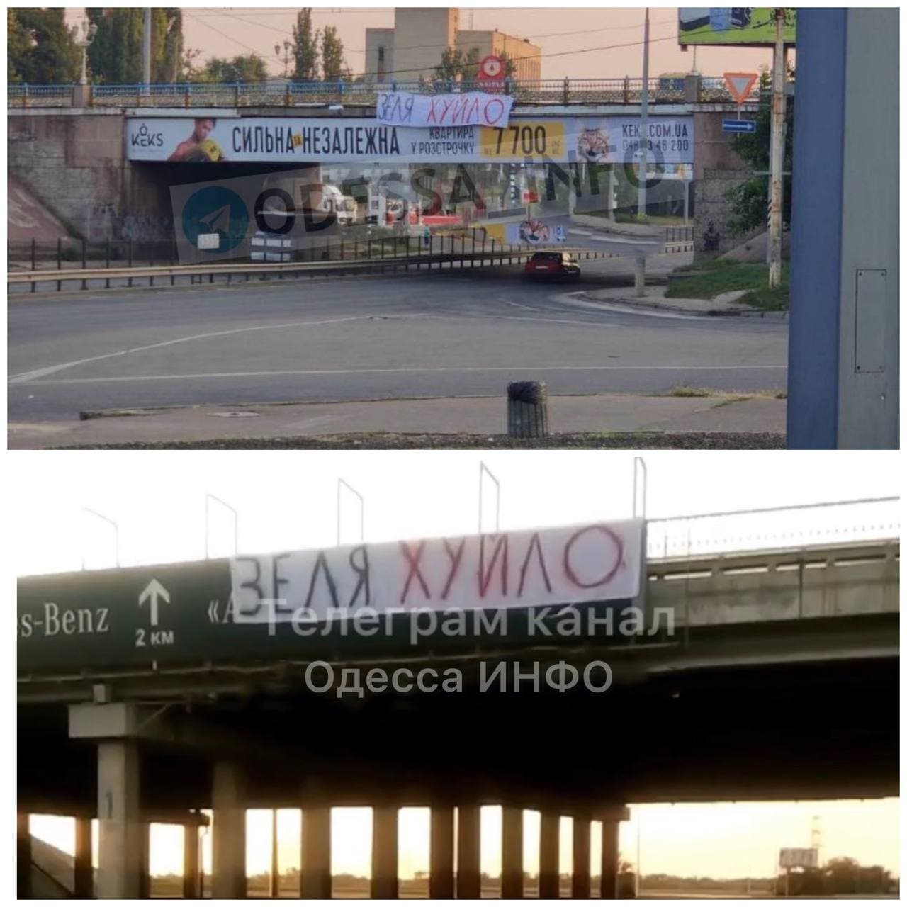 В Одессе на мостах и путепроводах развесили оскорбительные баннеры в адрес президента Владимира Зеленского. Правоохранители устанавливают злоумышленников, сообщает полиция области. Об этом сообщили в Telegram-канале "Х..евая Одесса".