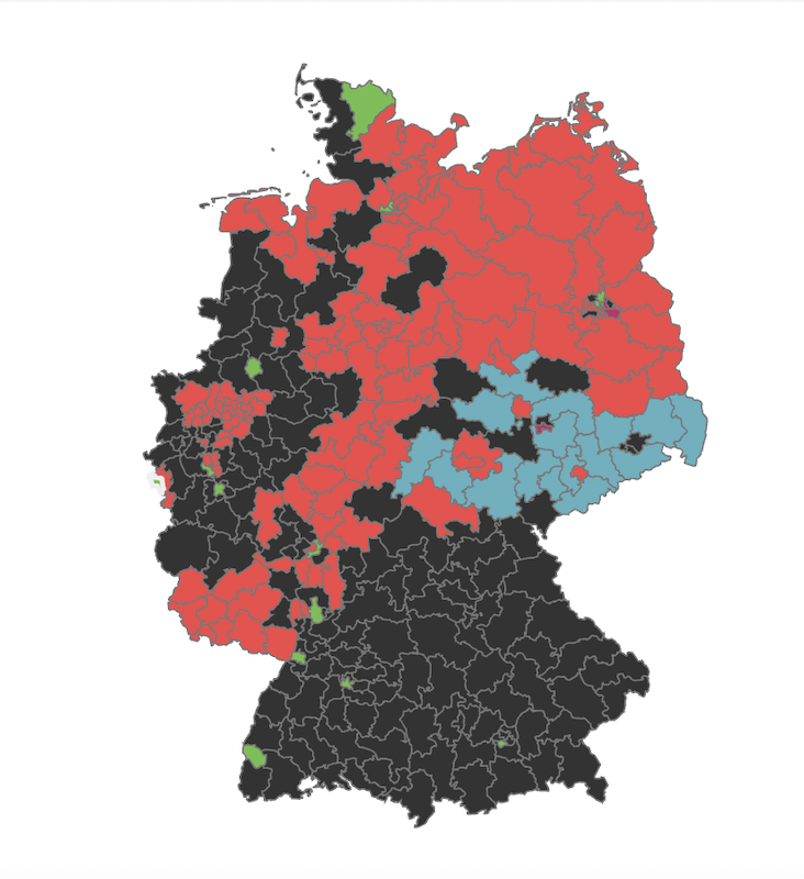 Причем очевидно, что это не крен Германии влево, а просто тот избиратель, который обычно поддерживал ХДС/ХСС, в лице Меркель, не дошел до избирательных участков. Об этом говорит и география голосования.