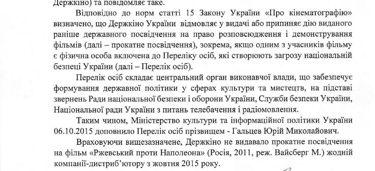 Запрет киноленты связан с российским комиком Юрием Гальцевым, который сыграл в "Ржевском против Наполеона" небольшую роль мэра.