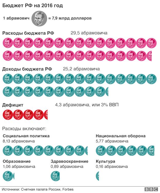 Российский бюджет на 2016 год в абрамовичах . Цифры поменялись, но суть-то осталась. Например, в 2015 г 1 абрамович был равен 7,9 млрд долларов российского бюджета