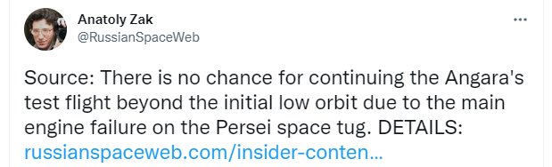 Российский любитель космоса Анатолий Зак, который порой первым выкладывает инсайды отрасли, пишет в Twitter, что "нет шансов на продолжение испытательного полета Ангары за пределами начальной низкой орбиты из-за отказа главного двигателя космического буксира Персей".